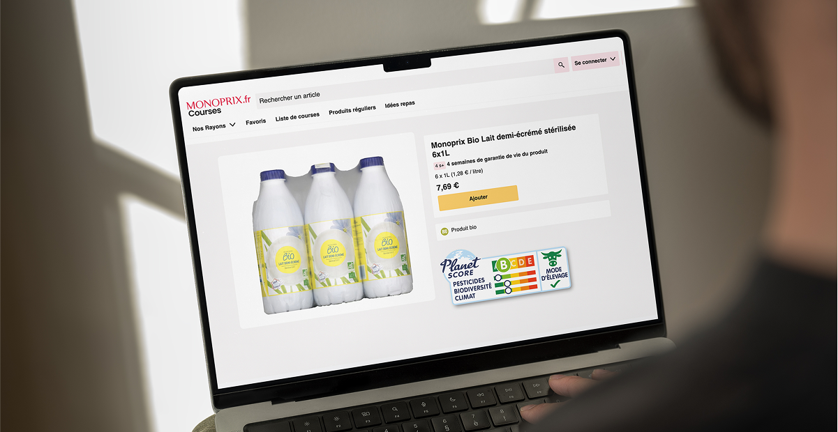 L’étiquette Planet-score est visible sur le drive et l'app de Monoprix. A terme, un affichage on pack ?